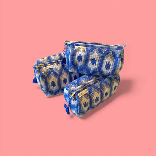Blue Ikat handblock print cosmetic bags