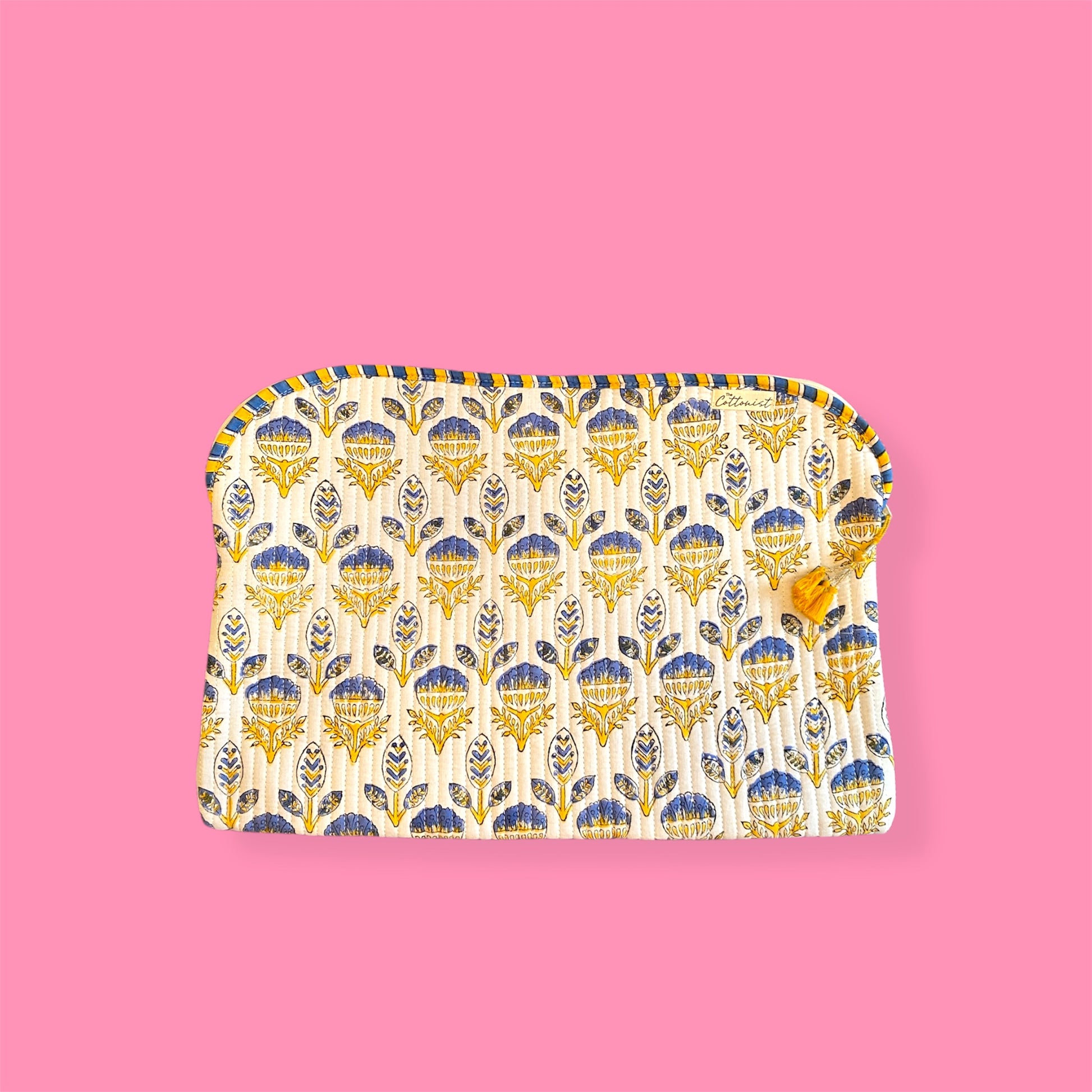Carry your tech in timeless style with our beautifully quilted laptop sleeve. Crafted from soft premium cotton, this sleeve features a delicate, hand-block floral print in hues of soft colors. Thoughtfully finished with striped piping and a handcrafted tassel pull, it blends functionality with refined artistry.