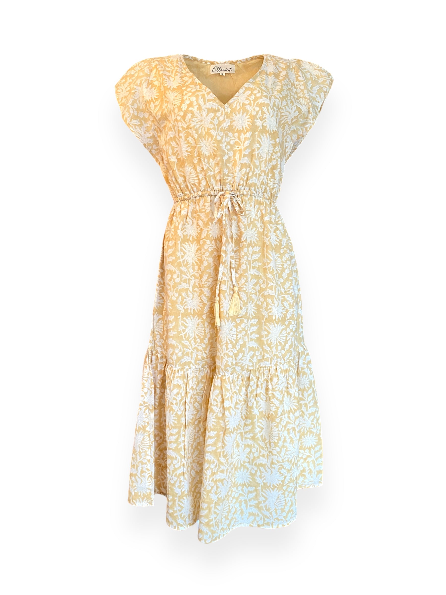 A prefect summer dress made in soft and breathable 100 % cotton. A capped sleeve dress, completely lined with soft cotton, has a flattering V neck, and a tiered skirt with pockets. Handblock printed in the most irresistible colours and print. A must have!