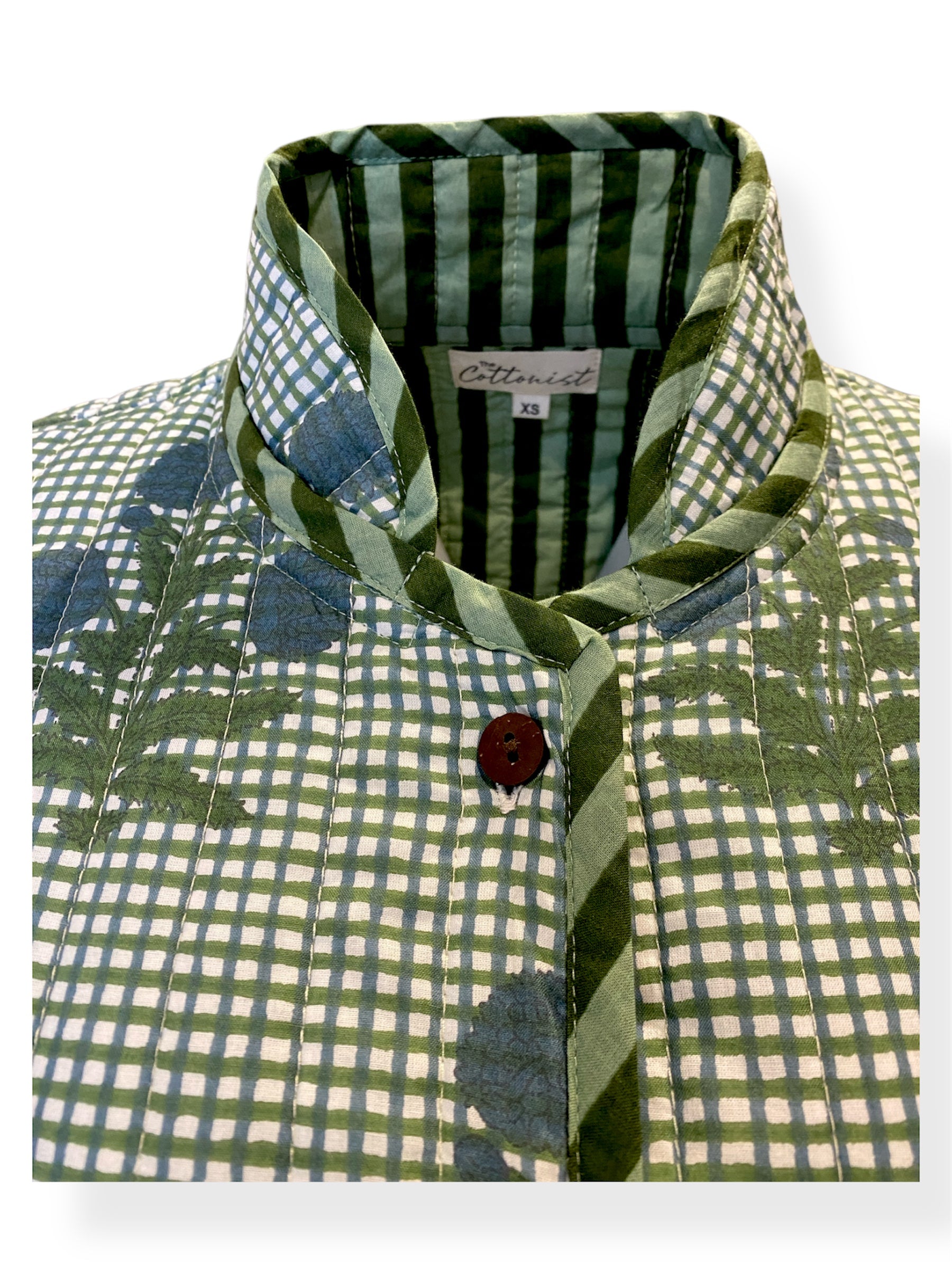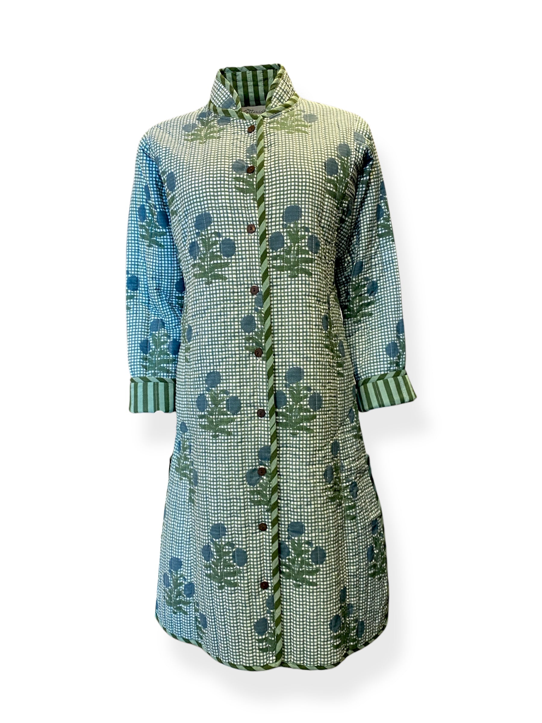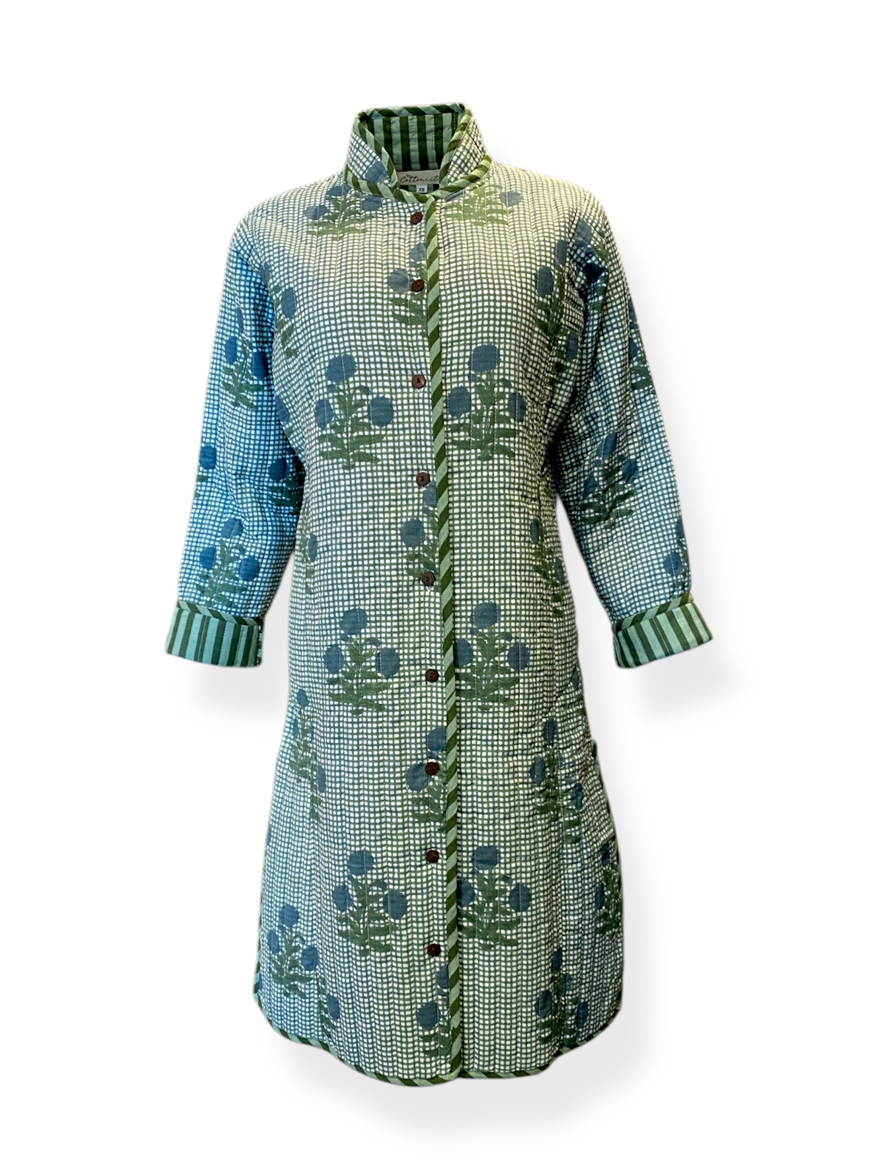 A jacket so beautiful and comfortable you wouldn’t want to take it off. In a relaxed fit featuring an exclusive The Cottonist handblock print with a contrast print lining inside, the soft cotton is quilted throughtout with extra stitch details at the neckline, cuffs and side pockets. Knee length with side slits featuring contrast print piping detailing. 100% cotton filling making it lightweight yet cosy.