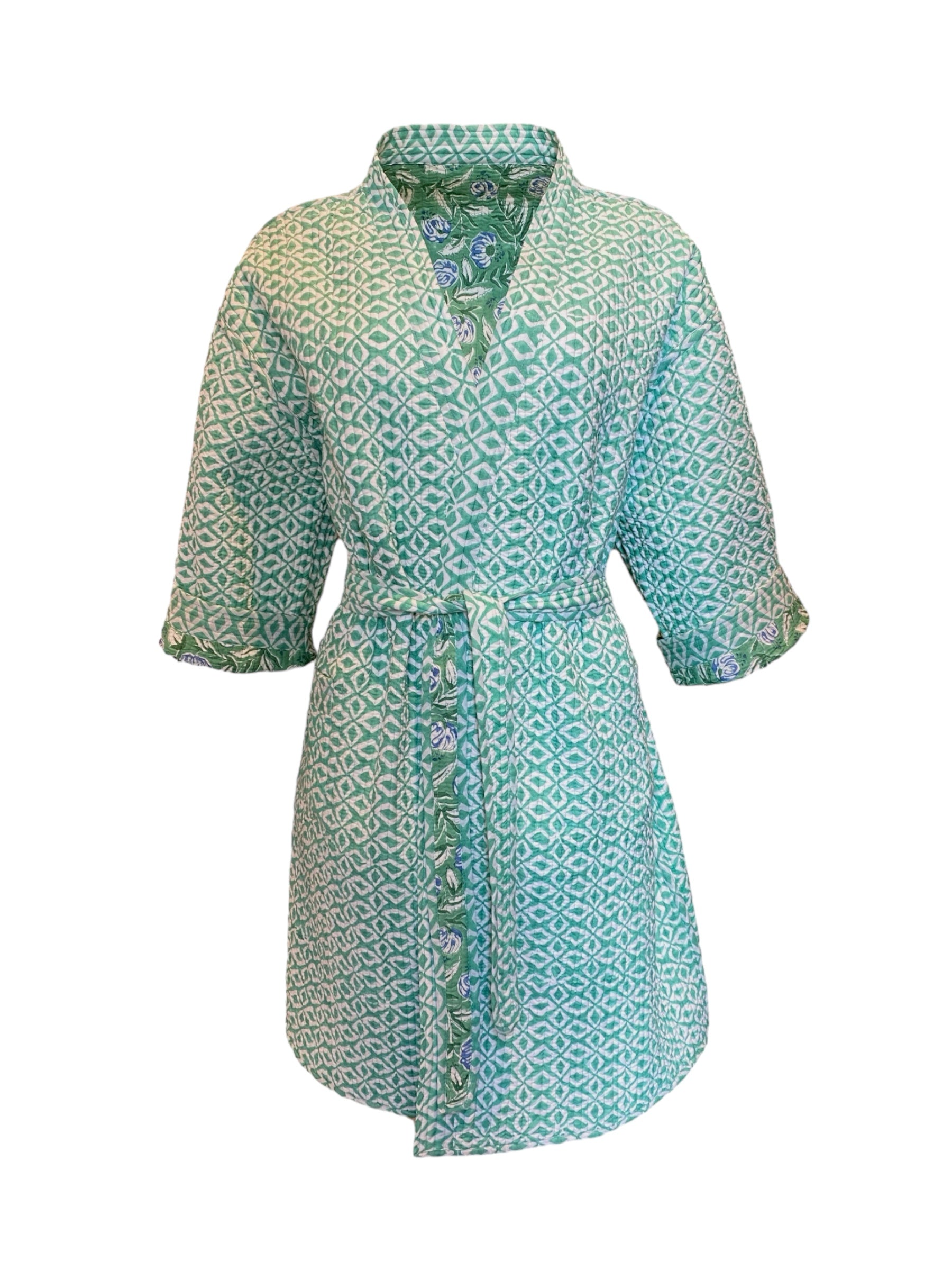 Green Pomegranate handblock print Reversible Quilted Kimono robe