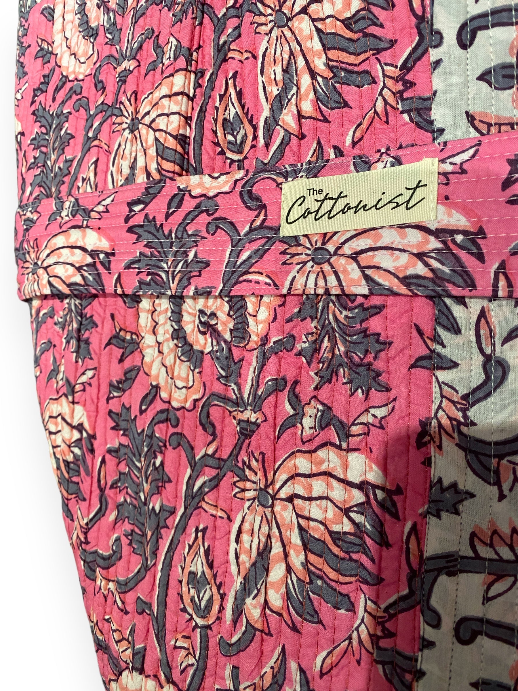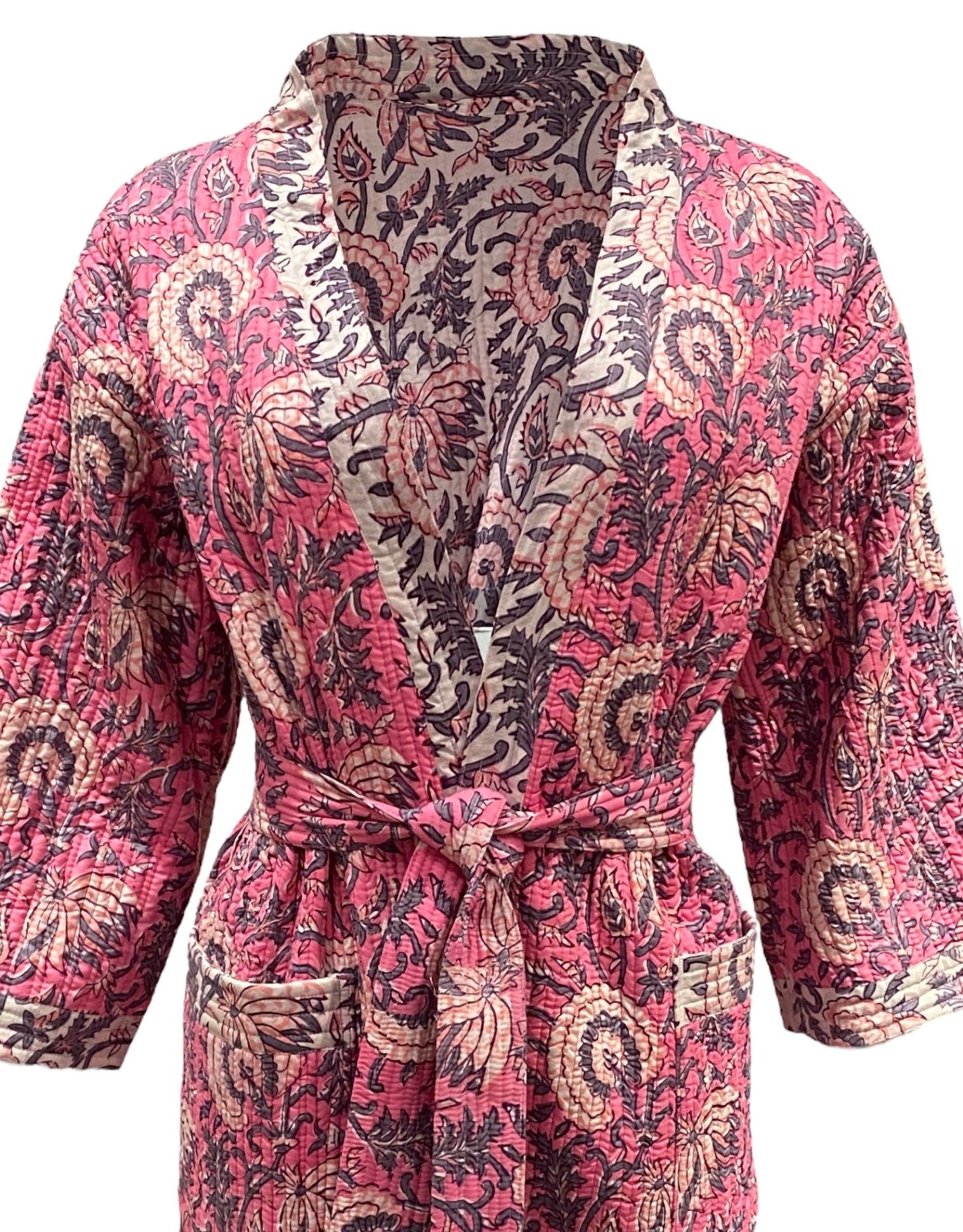 This statement piece of clothing from ‘The Cottonist’ is the cosiest of robes in 100% cottonin stunning handblock prints giving each piece a unique appearance. This chic yet relaxed silhouette features contrasting print to reverse with large front pockets (only on one side) and a tie to adjust sizing.