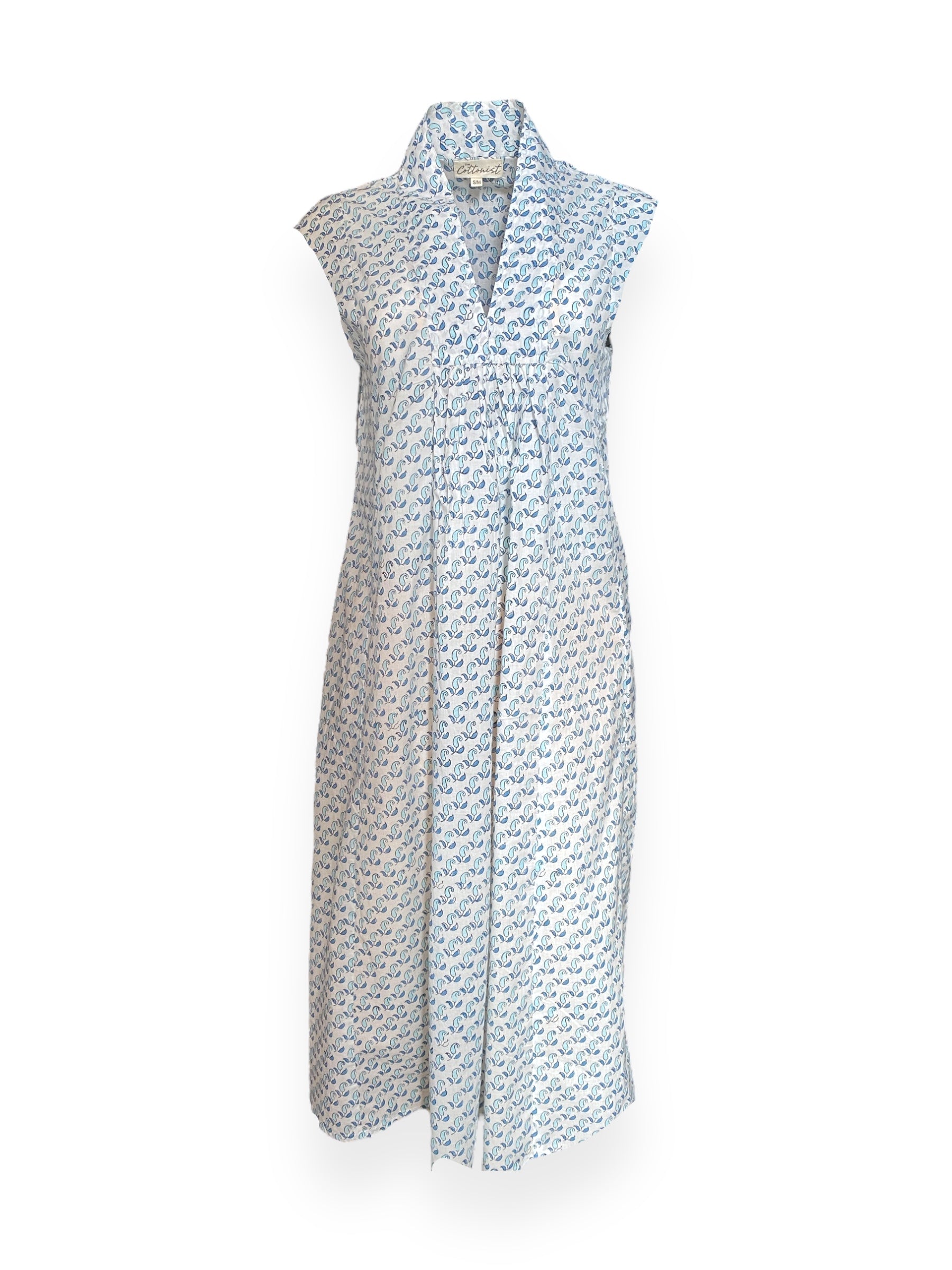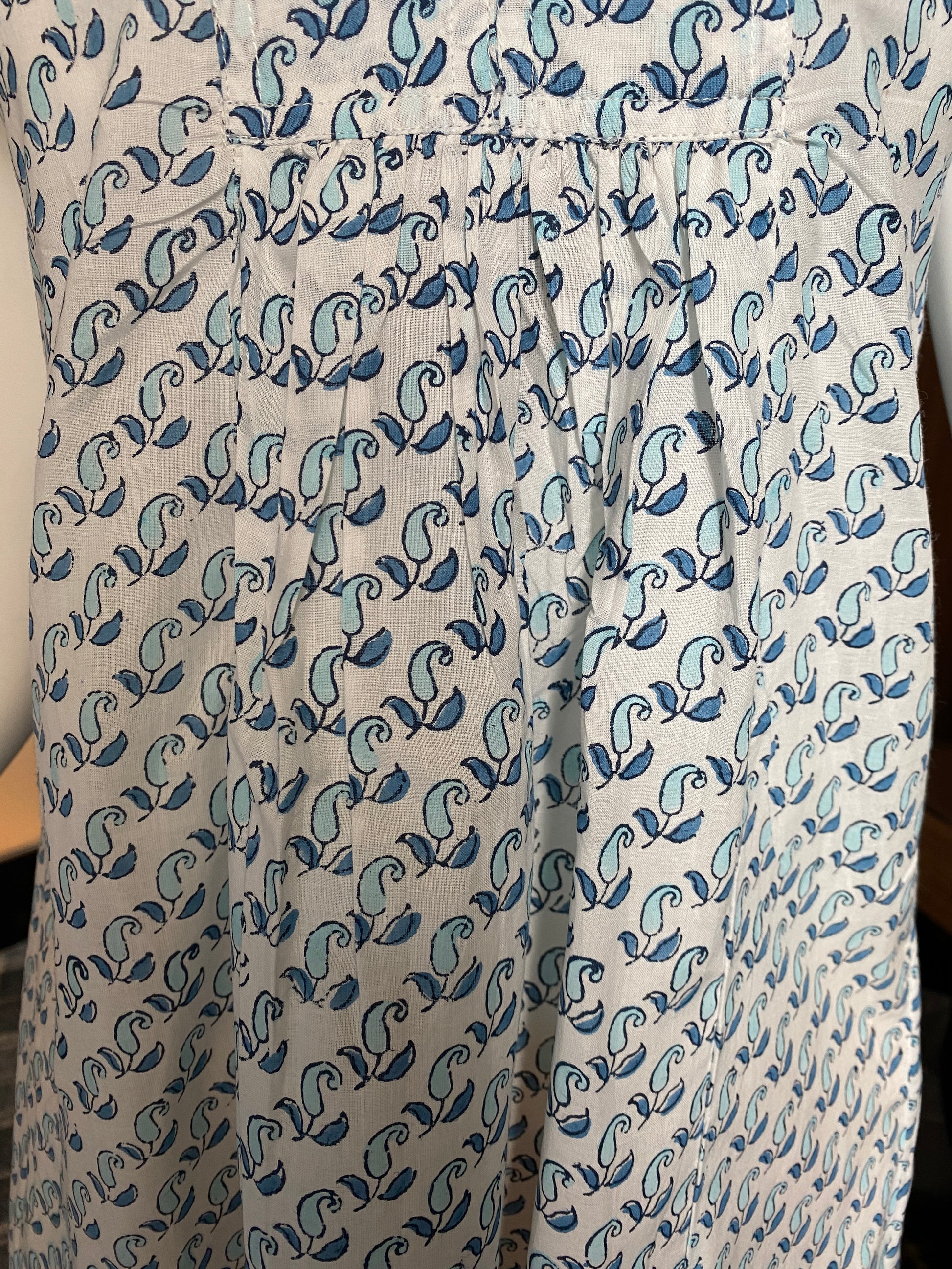 This lightweight nightdress in a beautiful Ice blue floral jaal handblock print, is cut in a super flattering shape with pockets. Its is a sleeveless nightdress with a tasteful deep V neckline.