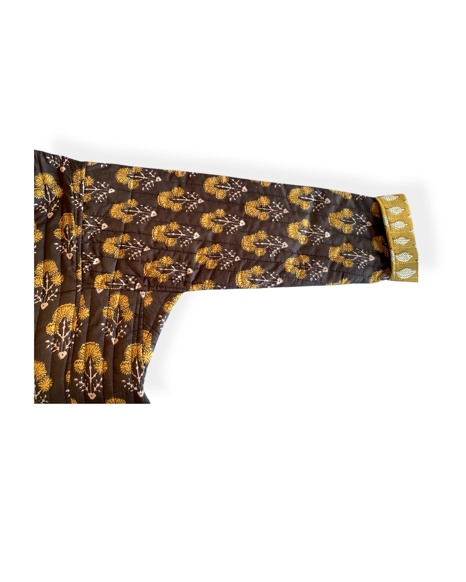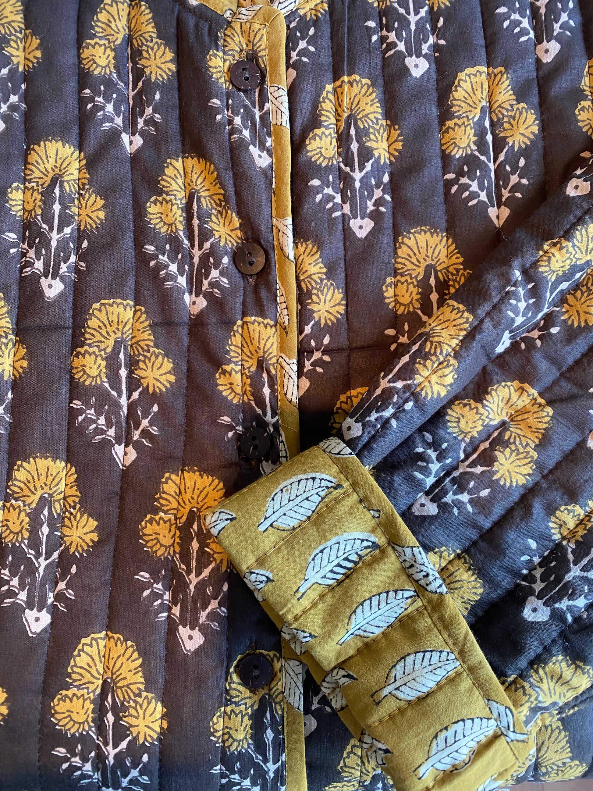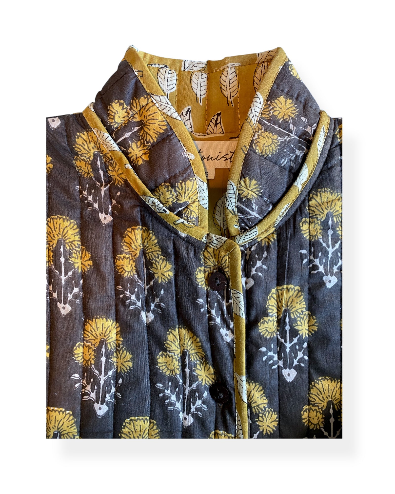 A jacket so beautiful and comfortable you wouldn’t want to take it off. In a relaxed fit featuring an exclusive The Cottonist handblock print with a contrast print lining inside, the soft cotton is quilted throughtout with extra stitch details at the neckline, cuffs and side pockets. Knee length with side slits featuring contrast print piping detailing. 100% cotton filling making it lightweight yet cosy.
