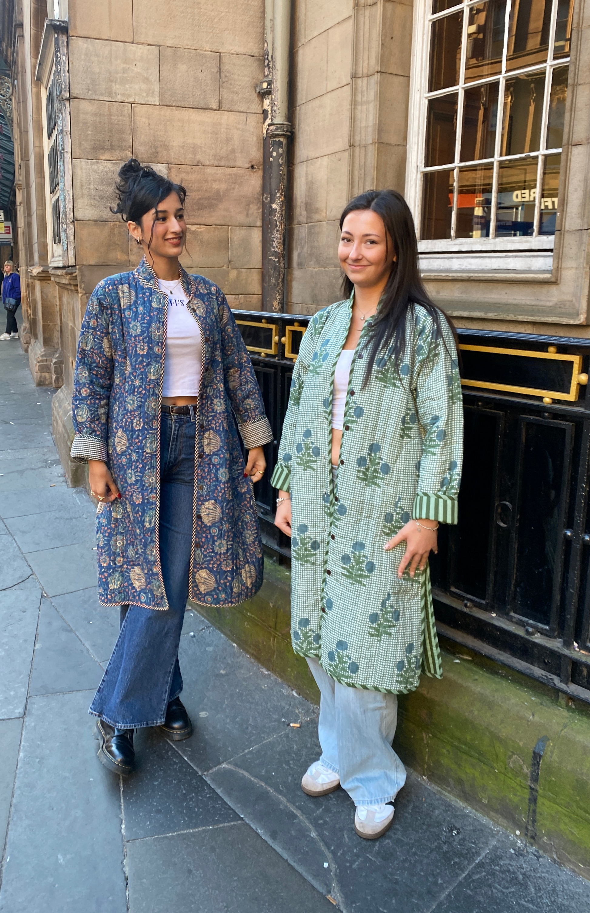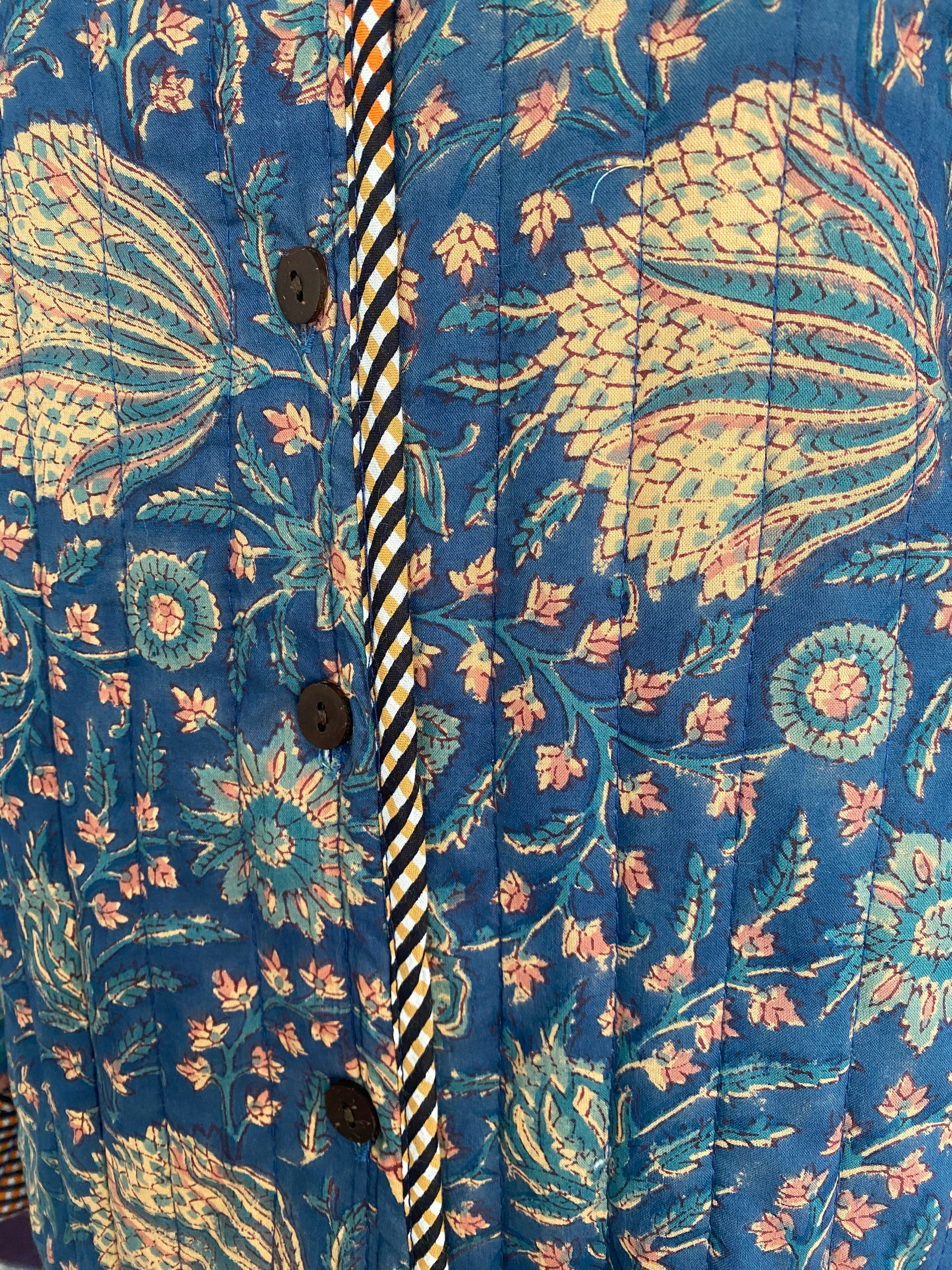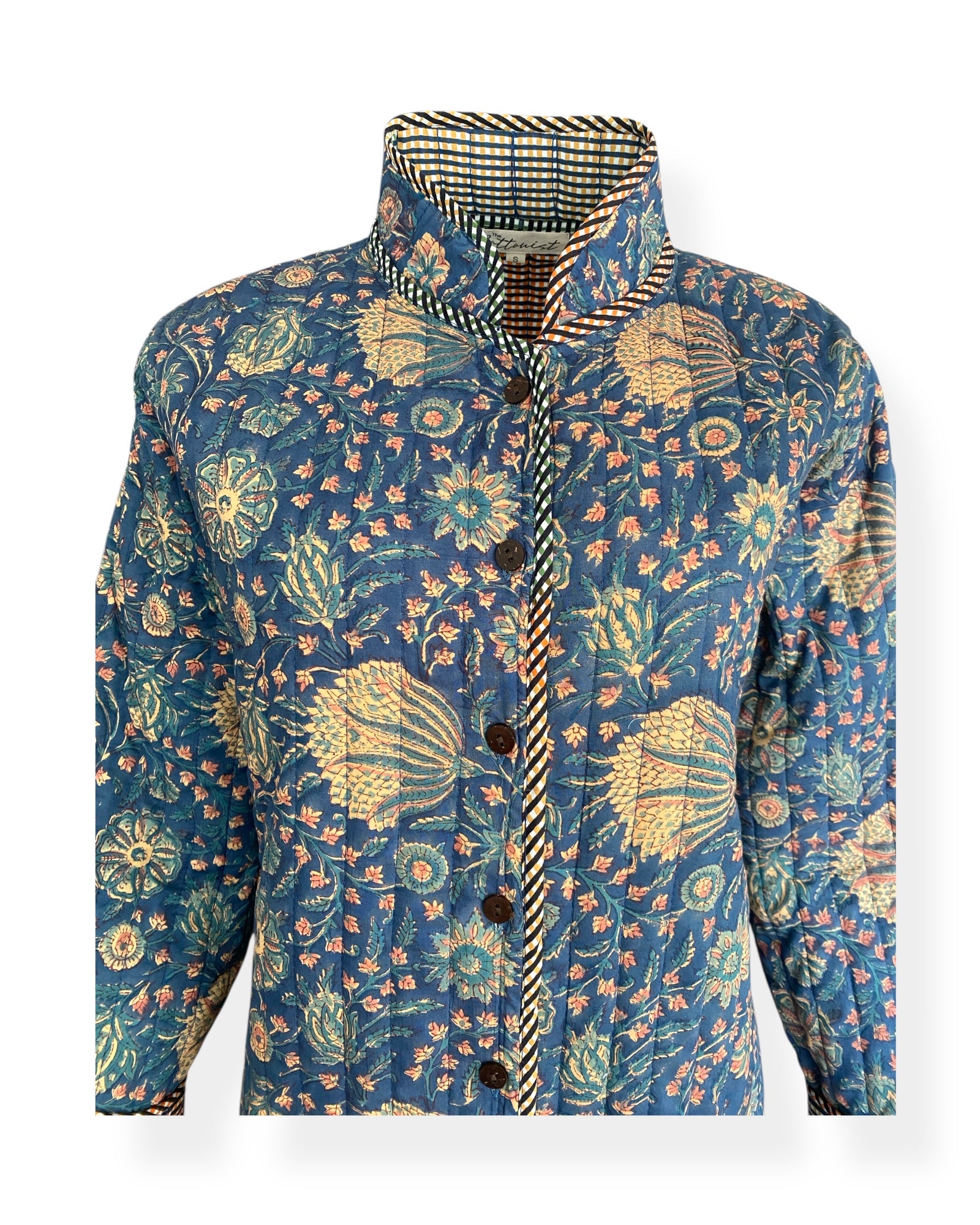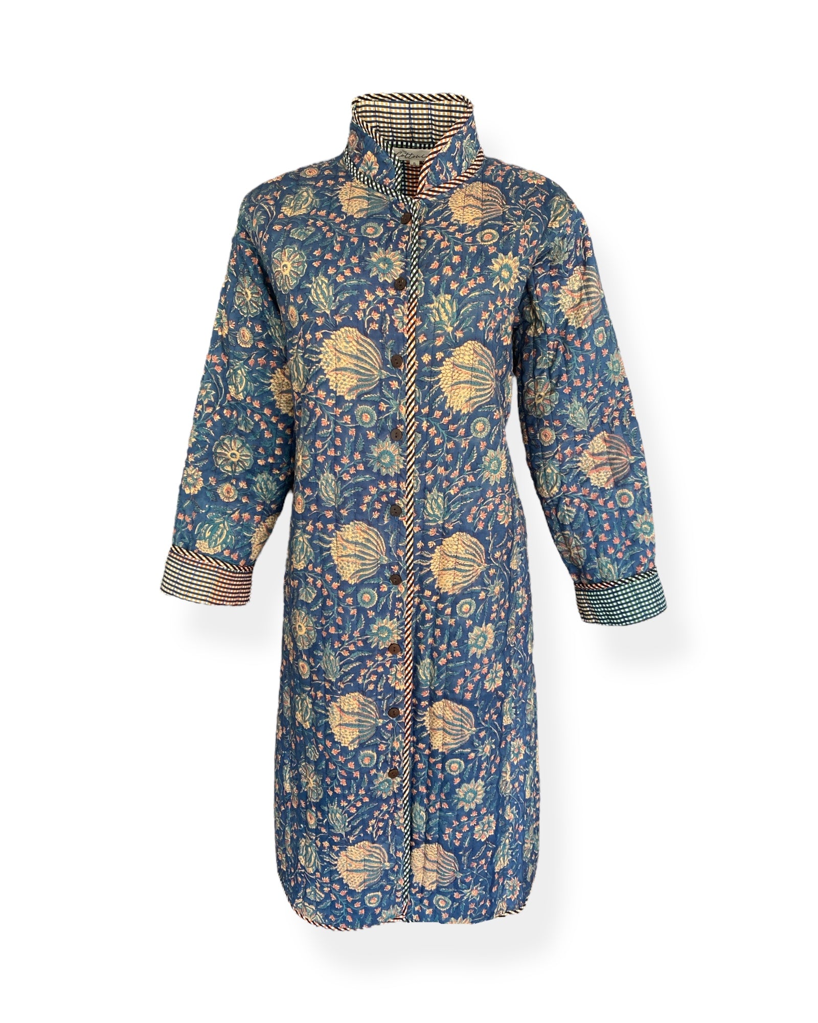 A jacket so beautiful and comfortable you wouldn’t want to take it off. In a relaxed fit featuring an exclusive The Cottonist handblock print with a contrast print lining inside, the soft cotton is quilted throughtout with extra stitch details at the neckline, cuffs and side pockets. Knee length with side slits featuring contrast print piping detailing. 100% cotton filling making it lightweight yet cosy.
