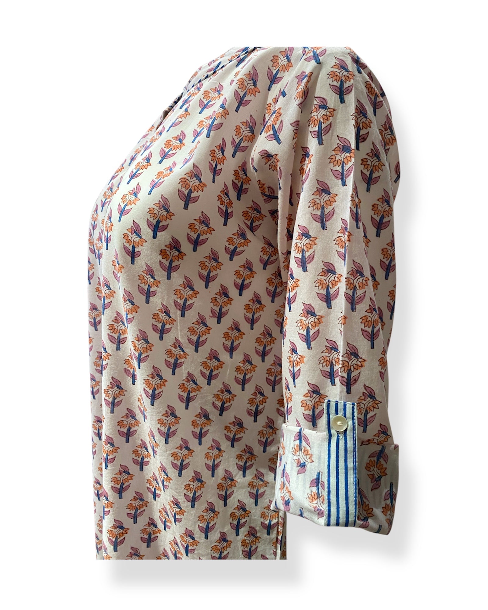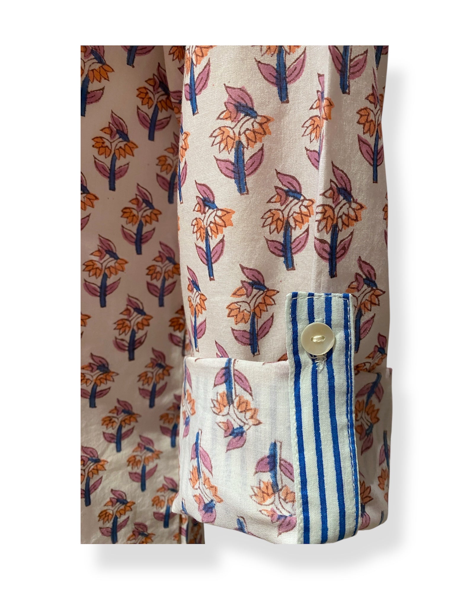 Stay stylish and comfortable even in your downtime with this beautifully designed nightshirt. Made from soft, breathable 100% cotton handblock print featuring an all over floral booti print in warm hues of peach orange, lavender purple and blue on a light background, giving it a fresh and feminine touch.