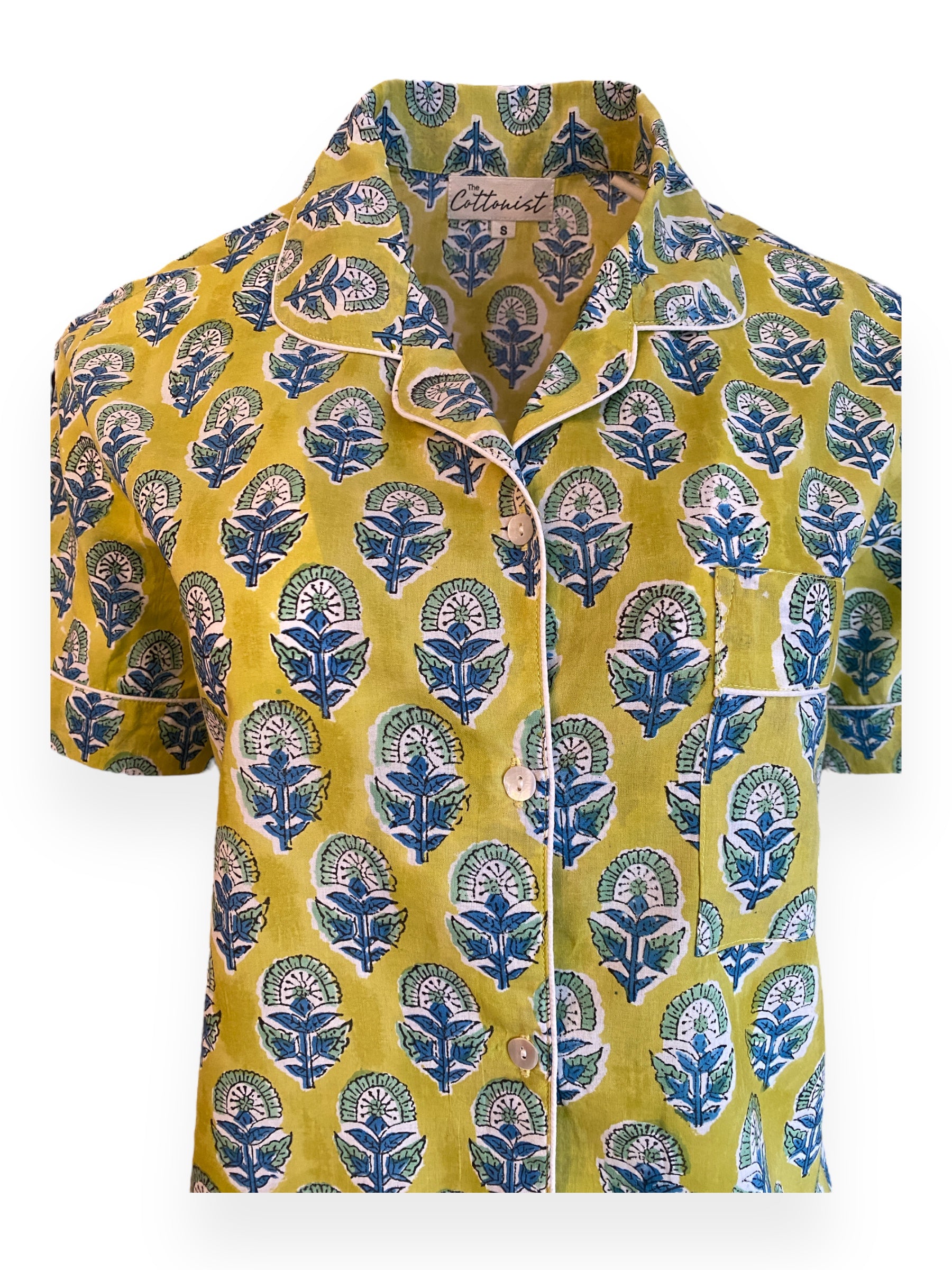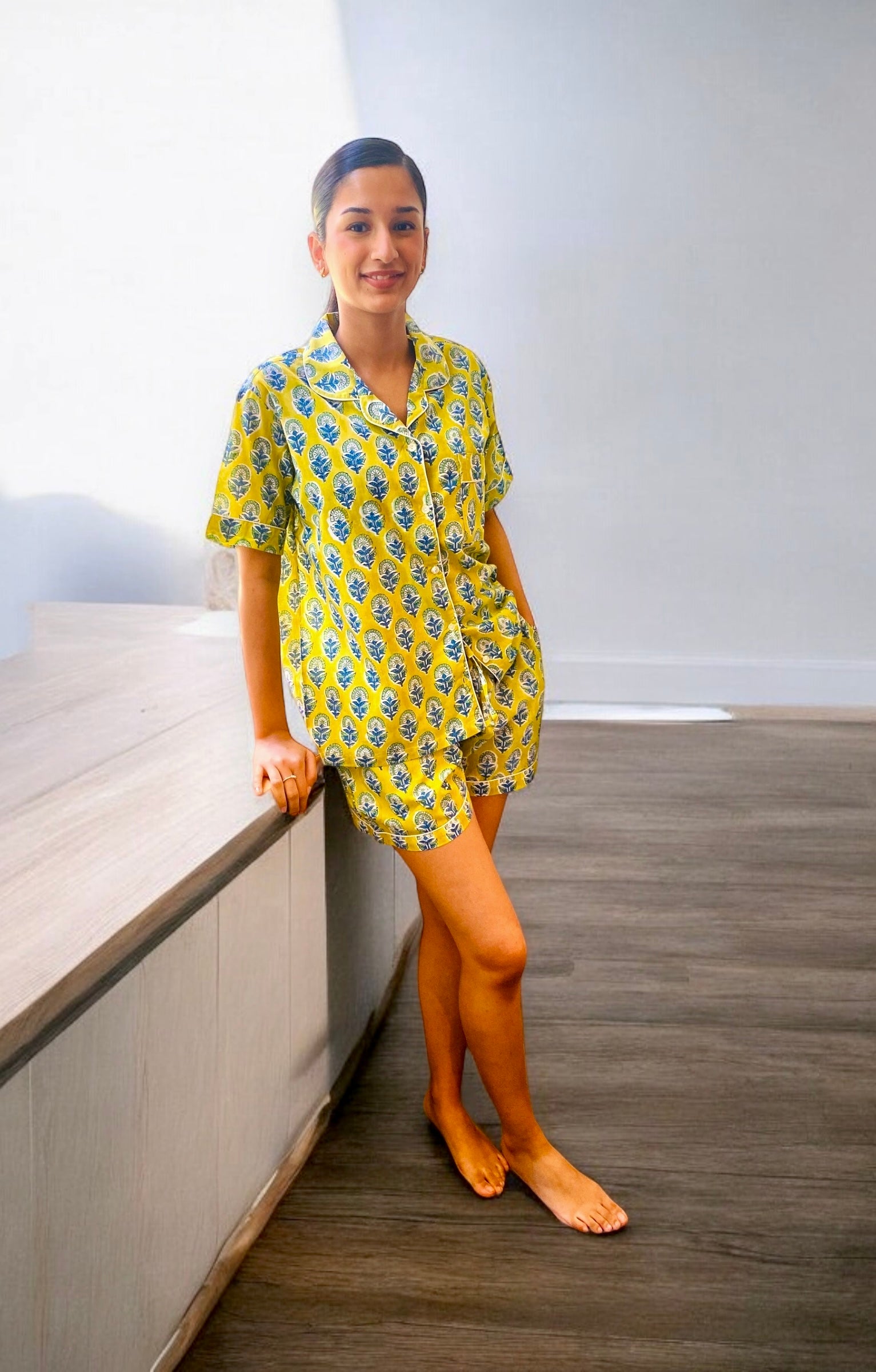 A Classic ‘The Cottonist’ shorts set is made from the softest Indian cotton by using the traditional art of hand block printing making every piece unique in it’s appearance and finished with white piping. The shorts feature a flexible, elasticated waistband, which can be worn high on the waist or low on the hips. The natural fabric is woven, then dyed and crafted into our shorts sets and packed in matching bags, which allow them to be transported using no plastic and can be a perfect gift in this cute bag packing.