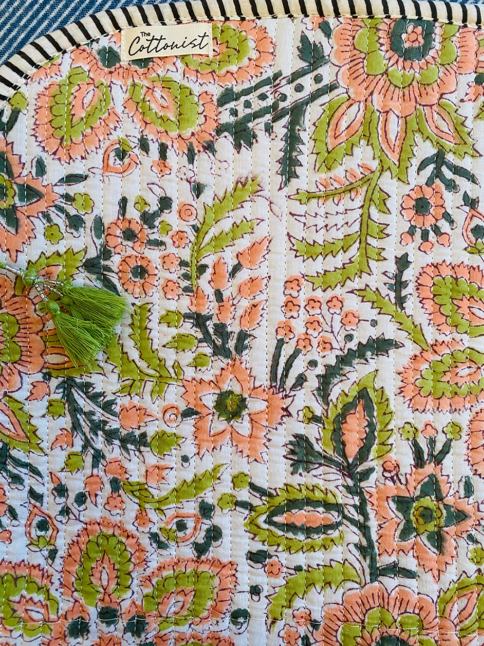 Carry your tech in timeless style with our beautifully quilted laptop sleeve. Crafted from soft premium cotton, this sleeve features a delicate, hand-block floral print in hues of soft colors. Thoughtfully finished with striped piping and a handcrafted tassel pull, it blends functionality with refined artistry.