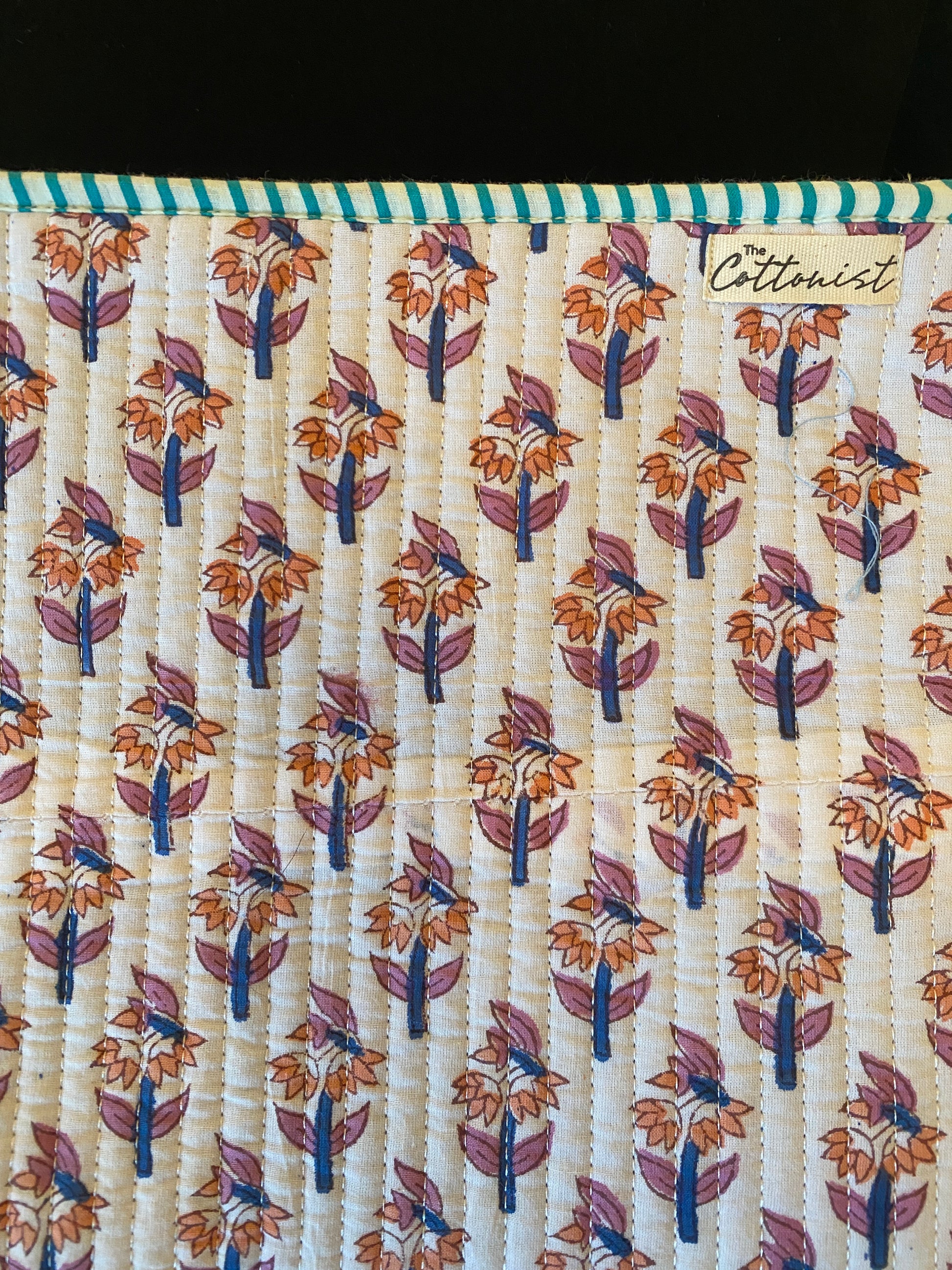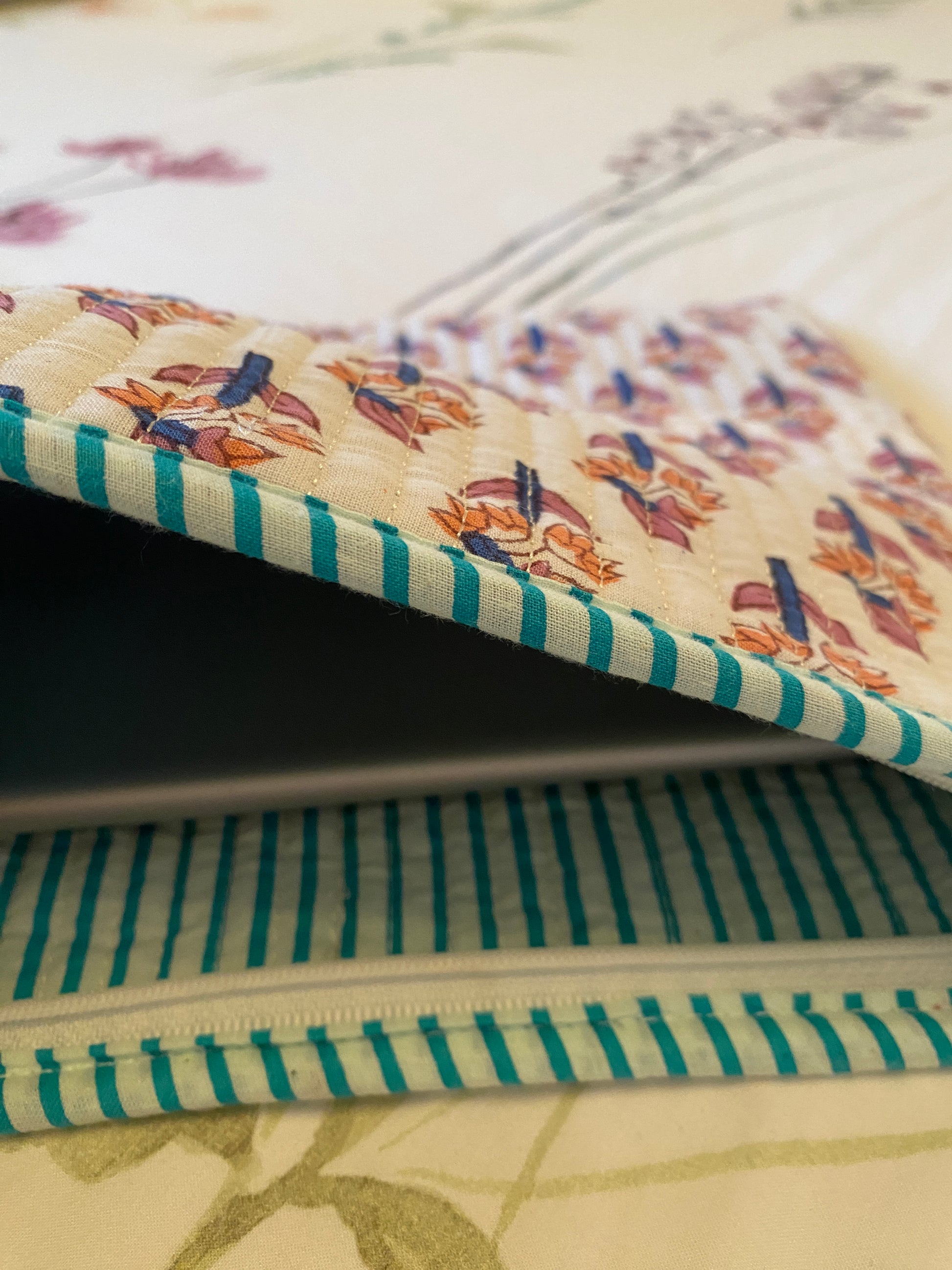 Protect your tablet in style with this beautifully quilted case, crafted from soft cotton fabric in beautiful hand block print. Designed for everyday use, it offers lightweight padding to keep your device safe from scratches and bumps, while the striped trim and zip closure add a refined finish.