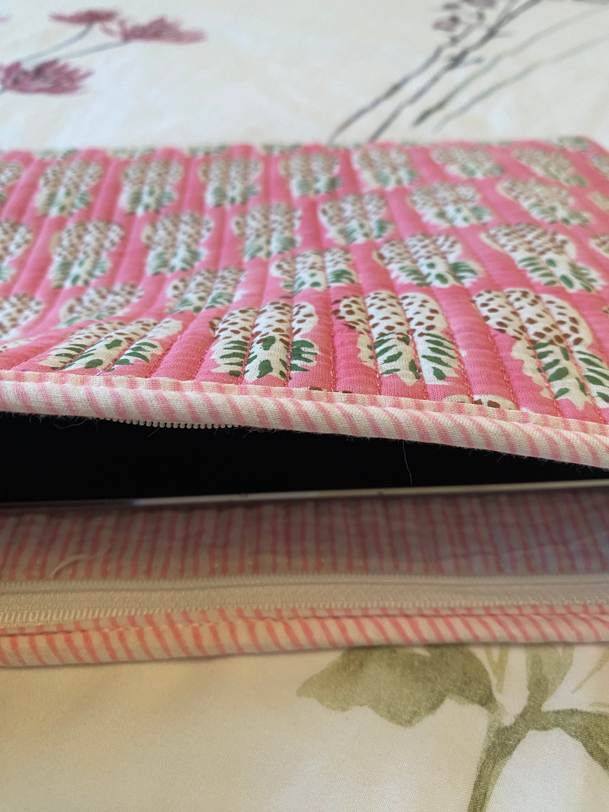 Protect your tablet in style with this beautifully quilted case, crafted from soft cotton fabric in beautiful hand block print. Designed for everyday use, it offers lightweight padding to keep your device safe from scratches and bumps, while the striped trim and zip closure add a refined finish.