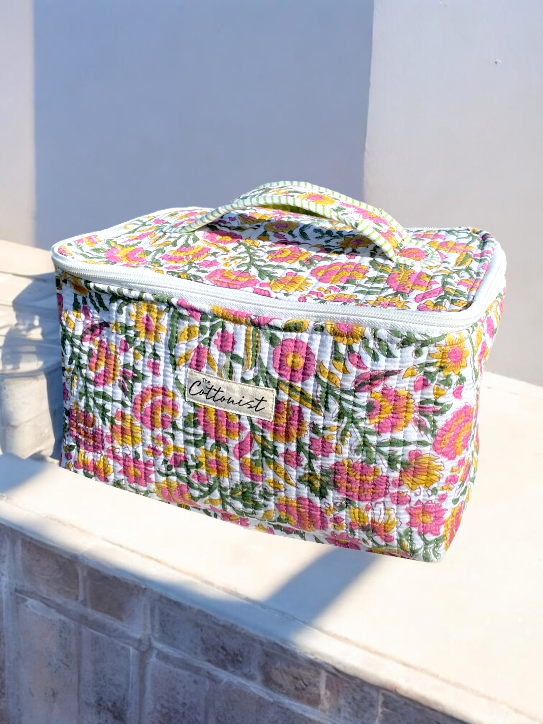 We are delighted to introduce our lovely handblock printed standing cosmetic/travel bags in stunning prints. These cosmetic cases are made of 100% cotton quilted material, finished with a zip.